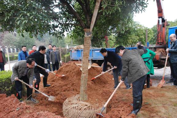 營地門口,開關(guān)站旁,大家齊心協(xié)力,分工合作,挖土、移栽、施肥、澆水,同事們你爭我趕,勞動場面熱火朝天,一棵棵金桂銀杏競相挺立。